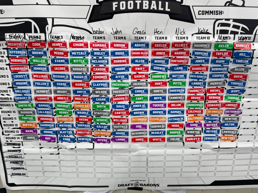 The draft order was then selected and we rolled right into it. Between the fun music, the Plum Tomato pizza, White Castle sliders and Chick-Fil-A nuggets, the draft dragged on a little. Markie through us three curve-balls and we will see if they pay off. Nick Chubb being selected 4th overall isn’t anything that eye-opening, but Markie could have gotten him pick 7. What were the real curveballs was Henry Ruggs in the 5th, and Cam Akers in the 11th. Henry Ruggs is going wayyyyy later in all drafts so either Markie knows something or he overreached. The Cam Akers pick is unfortunate because he was a big target of myself, but the dude is out for the year. Whoops! Gian picked three Bucs again, going with Mike Evans, Ronald Jones and Tom Brady. He has missed the playoffs the last two years so maybe the Bucs trio can help him reach the final part of the season. Our reigning Champ John had some bad luck. He selected JK Dobbins in the 3rd round, just to find out a few hours later he will miss the season. Matt, who lost to John in last year’s finals, took Gus Edwards in the 8th who now looks like great value. This might be the reason why ESPN ranks Matt as the best team coming in, with the highest projected total for week 1 as well.
