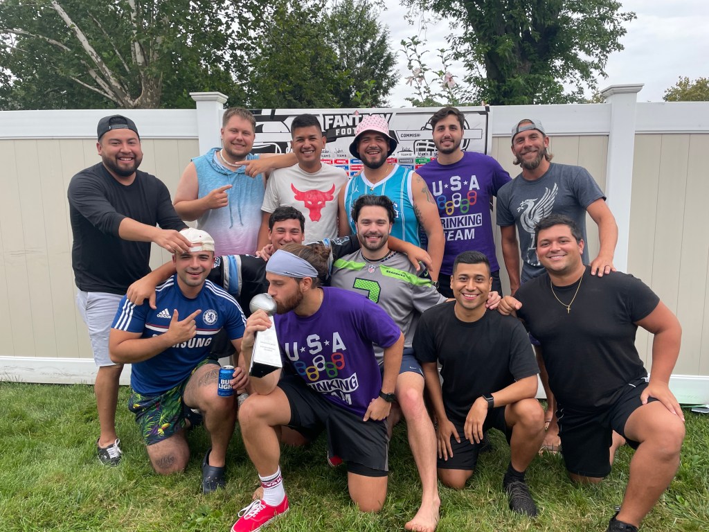 Gian, Jordan, Nick, Greg, John, Keke, Ant, Matt, and Markie helped grow this league for now the 6th year. Each year the trophy has switched hands from Gian to Nick to Jordan to Matt to John. To many, the trophy isn’t what we play for. To many, it is before the draft even starts. It is for the grueling marathon of Beer Olympics. After year one where we drafted in a living room with no pregame, we decided that the only way to determine our draft order was to be the hooligans we are and do a Beer Olympics. The order of games have changed but the process stayed the same. Flip Cup, Beer Ball, Chug Off, Beer Pong. you and your teammate compete for the #1 spot in each game and at the end you add up the results. Within 15 minutes of the Olympics ending, our draft order is set and we are picking our teams. And if that doesnt sound intense enough, let’s flashback to 2017 where we had a party the night before for McGregor vs Mayweather, woke up, and then did an Olympics. Oh and how can we forget 2019 where we celebrated Greg’s birthday with a Tour de Booze in the Point Pleasant area the night before, and stumbled into the Olympics the next day. It takes a special kind of person to survive this league, to power through all of the drinking and in a snap of a finger its draft time!